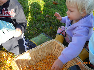 More corn pictures. You can see all of the different materials I had for the toddlers to scoop the corn with: cups, bottles, toilet paper tubes, and fruit baskets. |